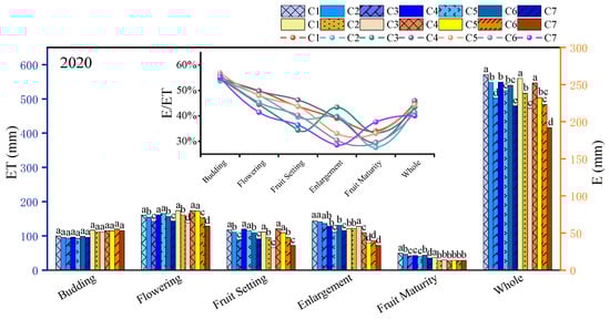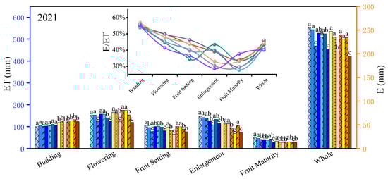 Variation law of jujube evapotranspiration under deficit irrigation in different growth stages in 2020–2021. Note: ET, evapotranspiration, mm; E, soil evaporation, mm; E/ET, soil evaporation/evapotranspiration. Different lowercase letters in the same column indicate significant difference at the 5% level.