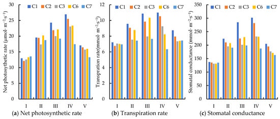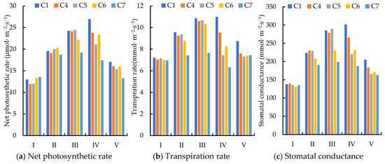 According to Figure 4, following water deficit, the net photosynthetic rates under C4 and C5 treatments decreased by 7.98% and 21.75%, respectively. These reductions are significantly greater than the decreases observed in the photosynthetic index during the flowering + fruit setting stage, indicating that the fruit enlargement stage is more sensitive to water deficit. A comparison of the C6 and C7 treatments under long-term deficit conditions reveals no significant difference in net photosynthetic rate, transpiration rate and stomatal conductance between long-term mild water stress and short-term water stress (p > 0.05).