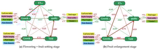 A partial least squares path modeling (PLS-PM) [28] approach was employed to analyze the relationships between growth indicators during the flowering + fruit setting stage (C1, C2, C3) and the fruit enlargement stage (C1, C4, C5), as well as their impacts on yield and quality. As depicted in Figure 5a, under water deficiency conditions, the direct effect coefficient of water consumption during the flowering + fruit setting stage on physiological indicators was 0.872 (p < 0.01), while the corresponding value during the fruit enlargement stage was only 0.245. Furthermore, the direct effect coefficient for both growth periods was negative (β = −0.345), indicating significant differences in the driving factors for the growth and development of jujube trees between the flowering + fruit setting stage and the fruit enlargement stage. Although growth parameters during the flowering + fruit setting stage contributed to a slight increase in jujube yield (direct effect coefficient 0.319), they exhibited a significant negative impact on quality (−0.613). This suggests that inhibiting growth during the flowering + fruit setting stage may positively affect fruit quality. Moreover, as illustrated in Figure 5b, the physiological indicators during the fruit enlargement stage were primarily driven by the irrigation quota for that growth period (direct effect coefficient 0.915). Additionally, growth performance during the fruit enlargement stage significantly influenced the yield and quality of jujube trees, with direct effects of 0.825 and 0.773, respectively, which were markedly higher than contributions from other growth stages. Thus, physiological indicators during the fruit enlargement stage are closely associated with fruit yield and quality, categorizing it as a water-sensitive period.