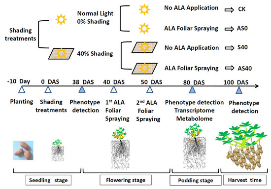 Outline diagram of the experimental process. A total of four treatments involved CK, AS0, S40, and AS40. The three sampling times were marked with blue triangles. The two ALA foliar spraying times were marked with pink triangles. DAS means day after shading.