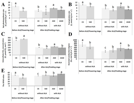 Photosynthesis indices of peanut plants, including the A value (A), E value (B), Ci value (C), Gs value (D), and SPAD value (E) were detected before (flowering stage) and after (podding stage) spraying with ALA in four treatments. Bars with different lowercase letters were significantly different from each other (p < 0.05).