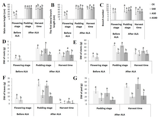 Phenotypes of peanut plants before (flowering stage) and after (podding stage) spraying with ALA under four treatments including the main stem height (A), the first lateral branch length (B), branch number (C), and the dry weights (DWs) of the roots (D), stems (E), leaves (F), and pods (G). Bars with different lowercase letters were significantly different from each other (p < 0.05).