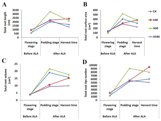 The growth parameters of the roots, including total root length (A), total root surface area (B), total root volume (C), and total number of root tips (D) before (flowering stage) and after (podding stage and harvest time) spraying with ALA under four treatments.