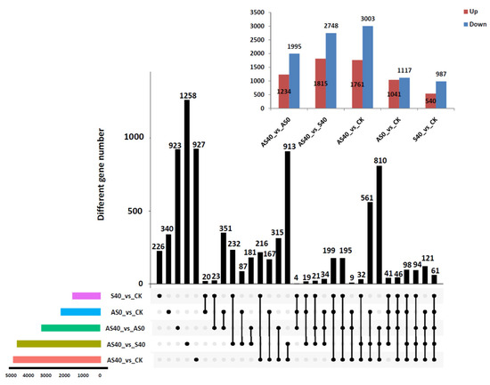 DEG analysis of transcriptome results between each treatment. In the upper right bar chart, red bars and blue bars represented up-regulated and down-regulated DEGs between treatments, respectively. In the bar chart below, each row represents a differential comparison group, and the colored bar chart represents the number of differential genes in each differential comparison group. The black dots indicate the differentially expressed genes belonging to a certain comparison group. The interconnected black dots indicate that there are common differentially expressed genes among several differentially expressed groups anchored by the black dots. The bar chart of different gene numbers represents the number of differentially expressed genes at the intersection of each comparison group.
