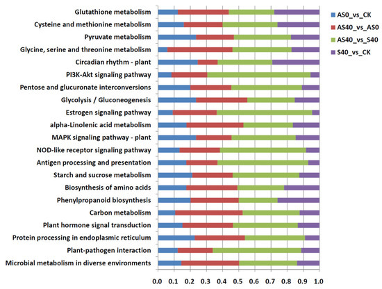 Additionally, a total of 226, 256, 257, 269, and 205 pathways were identified from the DEGs of the AS0 vs. CK, AS40 vs. AS0, AS40 vs. S40, AS40 vs. CK, and S40 vs. CK comparisons via KEGG pathway analysis, respectively. The top 20 enriched KEGG pathways, included phenylpropanoid biosynthesis, the biosynthesis of amino acids, starch and sucrose metabolism, alpha-linolenic acid metabolism, flavonoid biosynthesis, and photosynthesis (Figure 6). Similarly, when ALA was sprayed under the same lighting conditions, the DEGs were mainly enriched in those pathways (AS0 vs. CK and AS40 vs. S40), especially those related to protein processing in the endoplasmic reticulum and amino acid metabolism (“glycine, serine and threonine metabolism”, “cysteine and methionine metabolism”, and “tyrosine metabolism”) (Figure 6).