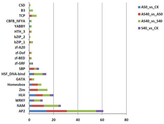 Among the DEGs, a total of 306 transcription factor (TF) genes affiliated with 21 TF families were related to the responses to shading stress and ALA modulation, including 31.8% from AP2, 13.1% from NAM, 7.9% from the HLH family, and 5.6% from WRKY (Figure 7). A significantly high proportion of AP2 (72.4%) was distributed in the ethylene-responsive transcription factor (ERF) family, suggesting that ERF genes play key roles in the regulation of related response gene networks under shade stress and exogenous ALA application. In both the AS0 vs. CK and AS40 vs. S40 comparisons, the expression levels of three and one ERF genes increased, respectively, while the expression levels of the vast majority of the other genes decreased. One ERF gene (ERF027) was identified in both the AS0 vs. CK and AS40 vs. S40 comparisons, indicating that it plays a key role in ALA application regulation under different light conditions. In addition, most NAM genes (90%) were distributed among five NAC domain-containing protein genes (including NAC domain-containing protein 2, NAC domain-containing protein 29, NAC domain-containing protein 72, NAC domain-containing protein 90, and NAC domain-containing protein 100), with decreased expression levels in all comparisons. The HLH transcription factor was mainly composed of bHLH14 and MYC2 in the AS0 vs. CK and AS40 vs. AS0 comparisons, with reduced expression levels. These down-regulated expression levels indicate that these TFs are crucial for downstream gene transcriptional regulation under shading stress and ALA regulation.