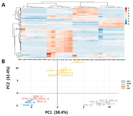 The hierarchical clustering heatmap (A) and principal component analysis (PCA) of metabolomic data (B). The samples within the treatment are gathered together. Each treatment contains six samples, labeled as AS40-1~AS40-6, CK-1~CK-6, S40-1~S40-6, and AS0-1~AS0-6.