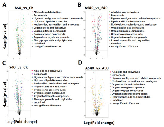 The abundances of metabolites significantly changed between four comparisons. In the comparisons of AS0 vs. CK (A), AS40 vs. S40 (B), S40 vs. CK (C), and AS40 vs. AS0 (D), differential metabolites were labeled as colored dots with a fold change ≥1.6 (up-regulated) or ≤0.625 (down-regulated) and a p-value < 0.05. The horizontal axis represents the fold change in gene expression in different experimental treatments. The vertical axis represents the statistical significance of changes in gene expression levels. The scattered dots in the figure represent each gene. Black dots below the horizontal dashed line represent genes with no significant differences. The colored dots above the horizontal dashed line and to the right of the vertical dashed line represent up-regulated genes with significant differences. The colored dots above the horizontal dashed line and to the left of the vertical dashed line represent down-regulated genes with significant differences. The color represents the corresponding compounds in lists on the right.