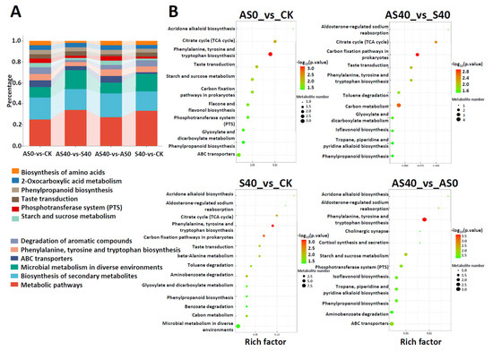 The DAMs were annotated using KEGG enrichment analysis and visualized in Figure 10, which shows the top 20 pathways with the greatest significance based on the p value. Among the comparisons under shading stress (S40 vs. CK and AS40 vs. AS0), significant enrichment was assigned to phenylalanine, tyrosine, and tryptophan biosynthesis, the degradation of aromatic compounds, the phosphotransferase system (PTS), and citrate cycle (TCA cycle) metabolic pathways. Furthermore, after ALA application under shading stress (AS40 vs. S40), the metabolites related to “carbon metabolism” were enriched. When ALA was applied under normal sunlight conditions (AS0 vs. CK), the metabolites were assigned to phenylalanine, tyrosine, and tryptophan biosynthesis, the phosphotransferase system (PTS), phenylpropanoid biosynthesis, and the biosynthesis of amino acids. A considerable portion of metabolites were enriched in the biosynthesis of the secondary metabolites pathway, the phosphotransferase system, and amino acid metabolism in peanut leaves under shading stress and ALA application, which suggests that these important metabolic pathways are related to the ability of ALA to enhance shading resistance.