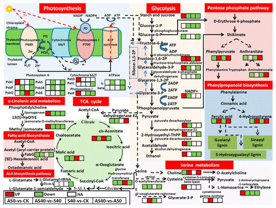 Candidate metabolic pathway related to shading stress and exogenous ALA application effects. Four comparisons (AS0 vs. CK, AS40 vs. S40, S40 vs. CK, and AS40 vs. AS0) were used to detect the important correlated pathways. Red box represents up-regulated DEGs/DAMs. Green box represents down-regulated DEGs/DAMs. White box represents no significant change in comparisons.