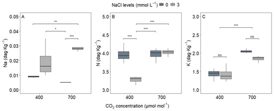 Leaf content of (A) sodium, (B) nitrogen, and (C) potassium in upland rice (Oryza sativa L. cv. CMG 2085) grown under two NaCl concentrations (0 and 3 mmol L−1) and two atmospheric CO2 levels (400 and 700 μmol mol−1). Measurements were taken at the V13 phenological stage (flag leaf formation). Significance levels according to Tukey’s HSD test (p < 0.05, n = 20): *** p < 0.001, ** p < 0.01, * p < 0.05, ns = not significant (p > 0.05). Note: 1 dag kg−1 = 10 g kg−1.