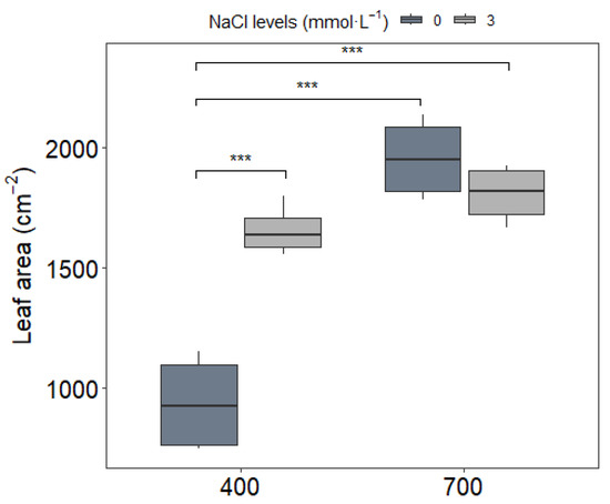Leaf area of upland rice (Oryza sativa L. cv. CMG 2085) grown under two NaCl concentrations (0 and 3 mmol L−1) and two atmospheric CO2 levels (400 and 700 μmol mol−1). Measurements were taken at the V13 phenological stage (flag leaf formation). Significance levels according to Tukey’s HSD test (p < 0.05, n = 20): *** p < 0.001.
