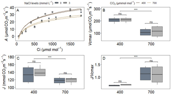 Photosynthetic parameters derived from A/Ci curves under 21% O2 in upland rice (Oryza sativa L. cv. CMG 2085) grown under two NaCl levels (0 and 3 mmol L−1) and two CO2 concentrations (400 and 700 μmol mol−1). (A) Representative A/Ci curves; (B) maximum RuBisCO carboxylation rate (Vcmax); (C) electron transport rate (J); (D) J/Vcmax ratio. Significance levels according to Tukey’s HSD test (p < 0.05, n = 4): *** p < 0.001, ns = not significant (p > 0.05).