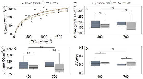 Photosynthetic parameters derived from A/Ci curves under 2% O2 in upland rice (Oryza sativa L. cv. CMG 2085) grown under two NaCl levels (0 and 3 mmol L−1) and two CO2 concentrations (400 and 700 μmol mol−1). (A) Representative A/Ci curves; (B) maximum RuBisCO carboxylation rate (Vcmax); (C) electron transport rate (J); (D) J/Vcmax ratio. Significance levels according to Tukey’s HSD test (p < 0.05, n = 4): ns = not significant (p > 0.05).