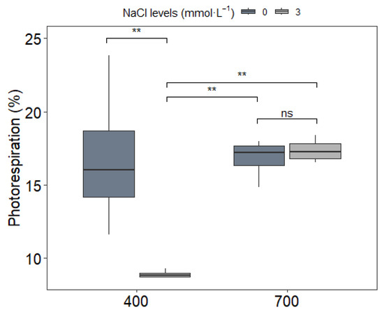 Photorespiration (%) in upland rice (Oryza sativa L. cv. CMG 2085) grown under two NaCl levels (0 and 3 mmol L−1) and two CO2 concentrations (400 and 700 μmol mol−1). Significance levels according to Tukey’s HSD test (p < 0.05, n = 4): ** p < 0.01, ns = not significant (p > 0.05).