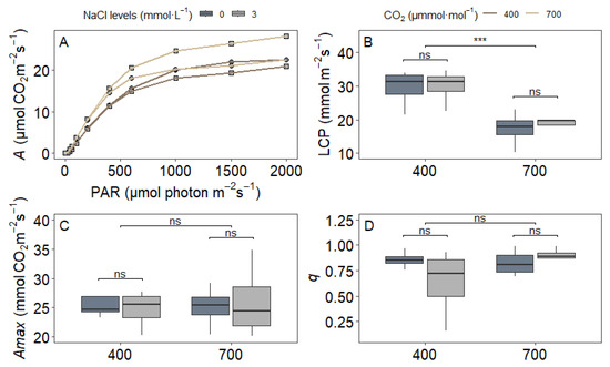 Photosynthetic parameters derived from A/PAR under 21% O2 in upland rice (Oryza sativa L. cv. CMG 2085) grown under two NaCl levels (0 and 3 mmol L−1) and two CO2 concentrations (400 and 700 μmol mol−1). (A) Representative A/Ci curves; (B) light compensation point (LCP), (C) maximum net assimilation rate (Amax), and (D) curvature (q). Significance levels according to Tukey’s HSD test (p < 0.05, n = 4): *** p < 0.001, ns = not significant (p > 0.05).