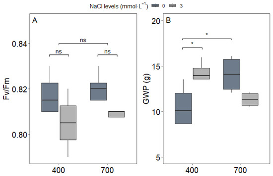 (A) Chlorophyll fluorescence (Fv/Fm), (B) grain yield per plant (GWP, g) in upland rice (Oryza sativa L. cv. CMG 2085) grown under two NaCl levels (0 and 3 mmol L−1) and two CO2 concentrations (400 and 700 μmol mol−1). Significance levels according to Tukey’s HSD test (p < 0.05, n = 4 for Fv/Fm and n = 8 for GWP): * p < 0.05, ns = not significant (p > 0.05).