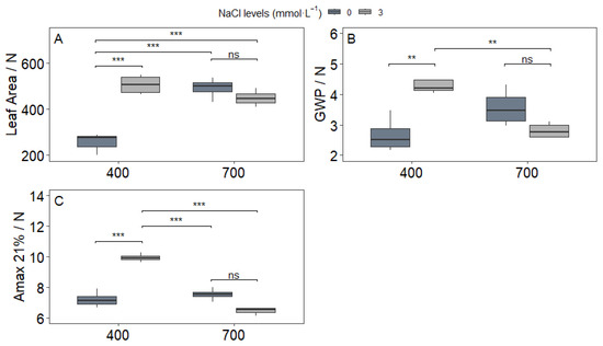 Nitrogen use efficiency indices: (A) Leaf area/N content (n = 8); (B) GWP/N content (n = 8); (C) Amax/N content (n = 4) in upland rice (Oryza sativa L. cv. CMG 2085) grown under two NaCl levels (0 and 3 mmol L−1) and two CO2 concentrations (400 and 700 μmol mol−1). Significance levels according to Tukey’s HSD test (p < 0.05): *** p < 0.001, ** p < 0.01, ns = not significant (p > 0.05).