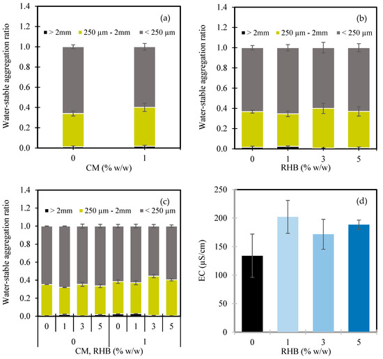 The distribution of three sizes of water-stable aggregates—MaAs (>2 mm), MeAs (250 μm—2 mm), and MiAs (<250 μm)—was significantly influenced by the application of CM, RHB, and their interaction (Table 2). The addition of 1% w/w CM resulted in an increase in the MaA proportion from 0.011 to 0.017 and the MeA from 0.330 to 0.385, while the proportion of MiAs decreased from 0.659 to 0.599 (Figure 1a). This shift toward larger aggregates suggests that CM may improve soil structure by enhancing aggregate stability, likely due to the increased organic matter input. Organic materials, such as manure, are known to contribute binding agents—including polysaccharides and decomposed organic residues—that support macroaggregate formation [38,39,40]. Previous studies have demonstrated that manure enhances MaA formation more effectively than inorganic fertilizers [41,42], with similar trends showing increased MaAs and decreased MiAs following organic amendment application [43,44,45]. Although the microbial activity was not assessed in this study, previous research has shown that organic inputs can stimulate microbial processes [46], which contribute to MaA formation through the production of extracellular binding agents and the physical entanglement of soil particles [47].