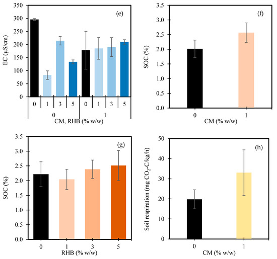 Regarding RHB, a gradual increase in the SOC was observed with higher application rates (Figure 1g). Compared to the control (0% w/w RHB, 2.2%), 1% w/w RHB slightly decreased the SOC to 2.1% (−7.7%), but the SOC content subsequently increased to 2.4% at 3% w/w RHB (+7.7%) and further to 2.5% at 5% w/w RHB (+13.1%). These results suggest that higher doses of RHB are more effective for enhancing the SOC due to the biochar’s high carbon content and its resistance to microbial decomposition, which promotes carbon sequestration in the soil over time [65,66,67].