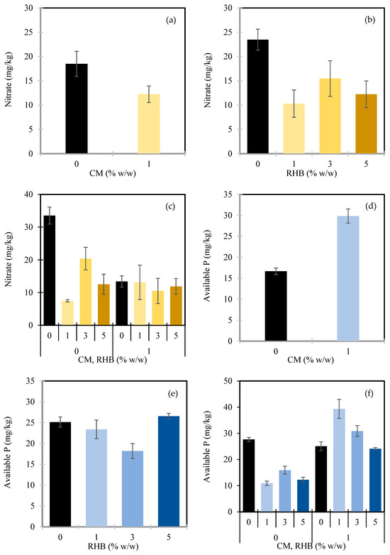 Nitrate (NO3−) concentrations in soils as influenced by manure (CM) (a), rice husk biochar (RHB) (b), and the interaction between CM and RHB (c). Available phosphorus (P) concentrations as affected by CM (d), RHB (e), and the interaction between CM and RHB (f). In Figure panels (c,f), the X-axes are grouped by CM application level: the left four bars represent CM at 0% w/w, and the right four bars represent CM at 1% w/w. Within each group, the bars correspond to increasing RHB application rates of 0%, 1%, 3%, and 5% w/w, respectively. The values represent the means ± standard deviation.