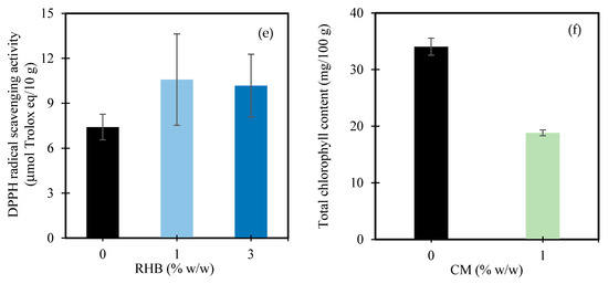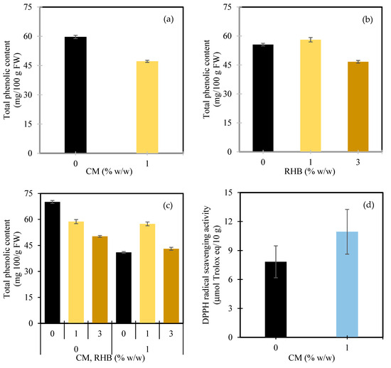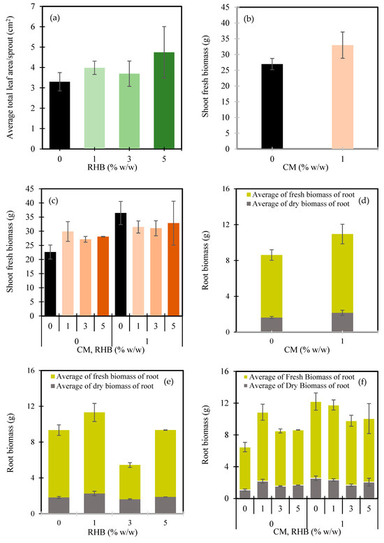 In contrast, the average total leaf area per sprout was significantly influenced by the RHB application (p < 0.05), while the CM and the CM × RHB interaction had no significant effects (Table 2). The leaf area increased progressively with higher RHB application rates (Figure 3a). Compared to the control (0% w/w RHB), which had an average leaf area of 3.30 cm2, the application of 1% w/w RHB increased the leaf area by 20.6%, the 3% w/w RHB led to an 11.8% increase, and the 5% w/w RHB resulted in the highest increase of 43.9%. This trend suggests that RHB can enhance early vegetative growth in sunflower sprouts and nutrient uptake by improving the soil’s physical and chemical properties, such as water retention, aeration, and nutrient availability [97]. These improvements likely support more efficient photosynthesis and cell expansion, resulting in larger leaf development [98]. Similar trends were observed in soybeans [99] and tomatoes and peppers [100] with biochar application. Interestingly, the lower effect observed at 3% w/w RHB compared to 1% w/w was unexpected, and may reflect nonlinear plant responses to the amendment levels or microenvironmental variability during the experiment. Although the interaction between the CM and RHB was not significant in this study, other research has shown that combining organic manure with biochar can increase the leaf area of crops, such as sweet potato [101] and cashew seedlings [102].