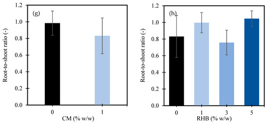 Average total leaf area per sprout as affected by rice husk biochar (RHB) (a). Shoot fresh biomass as influenced by manure (CM) (b) and the interaction between CM and RHB (c). Root biomass as influenced by CM (d), RHB (e), and the interaction between CM and RHB (f). Root-to-shoot ratio as influenced by CM (g) and RHB (h). In Figure panels (c,f), the X-axes are grouped by CM application level: the left four bars represent CM at 0% w/w, and the right four bars represent CM at 1% w/w. Within each group, the bars correspond to increasing RHB application rates of 0%, 1%, 3%, and 5% w/w, respectively. Values represent means ± standard deviation.