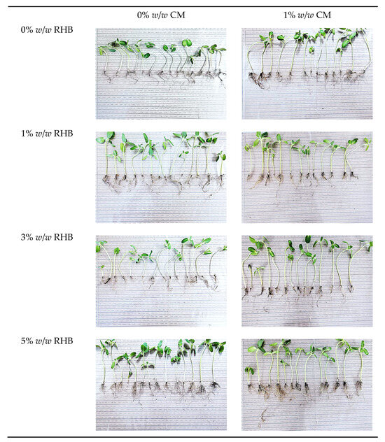 The application of the CM had a significant effect on all the biomass-related traits of the sunflower sprouts, including the shoot fresh biomass (p < 0.001), root fresh and dry biomass (p < 0.001), and the root-to-shoot ratio (p < 0.05) (Table 2). In contrast, the RHB significantly influenced only the root dry biomass (p < 0.01) and the root-to-shoot ratio (p < 0.01), while its effects on the shoot and root fresh biomass were not statistically significant. Notably, a significant interaction between the CM and RHB was observed for both the shoot and root fresh biomass (p < 0.05) and root dry biomass (p < 0.001), suggesting that the combined application of these amendments influenced biomass accumulation more than their individual effects.