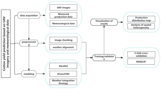 Figure 2 outlines the overall workflow of the proposed multimodal deep learning framework, encompassing five sequential phases: (1) UAV and meteorological data acquisition, (2) spatiotemporal preprocessing, (3) CNN architecture design with meteorological fusion, (4) model training and validation, and (5) yield prediction and spatial mapping. Specifically, multispectral images are first georeferenced and tiled into 1 m