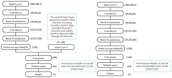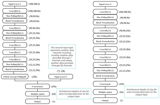 Figure 5) to strategically minimize information loss in early processing stages. The two architectures serve distinct roles: the modified AlexNet emphasizes stable fusion of high-dimensional visual and meteorological features, while the lightweight 2Conv CNN prioritizes computational efficiency through parameter reduction (87.6% fewer parameters) and spatial detail retention, aligning with real-time field monitoring requirements.