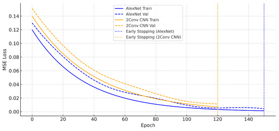 Figure 8, the loss function of AlexNet exhibits a significantly faster decrease in the initial phase of training (the first 50 rounds) in comparison to that of 2Conv CNN, indicating that the deep network possesses a superior capacity for abstracting multimodal features. However, the loss fluctuation of 2Conv CNN on the validation set is smaller (standard deviation: 0.018 vs. 0.027 for AlexNet), suggesting better generalization stability for small sample data. Furthermore, it was observed that both models plateaued after approximately 100 iterations (see