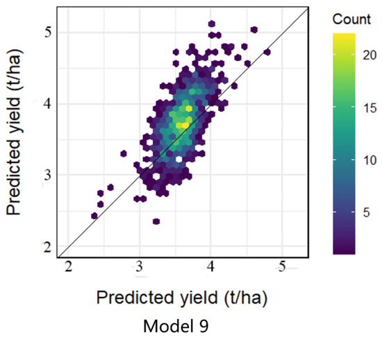 Dynamic fusion of meteorological data is at the heart of the model performance leap. Introducing week-scale meteorological factors (e.g., cumulative precipitation, average daily temperature) enables the model to capture key climatic events from the cotton bolling stage to the fluffing stage. For example, extremely high temperature (>35 °C) in the fourth week after flowering was found to be significantly negatively correlated with the model prediction error in the experiment (r = −0.52, p < 0.01), suggesting that the network corrected the bias of relying solely on the canopy greenness index by learning the inhibitory effect of temperature on cotton boll development. By nonlinearly splicing meteorological vectors (e.g., one-week climate index in dimension 12) with higher-order features of the image (AlexNet output in 256 dimensions) at the fully connected layer, the model constructed a joint representation mechanism of ’canopy photosynthetic potential-environmental stress response’. This high-level semantic fusion strategy avoids the problem of spectral–meteorological feature confusion caused by early splicing. It gives the model the ability to adjust the modal weights dynamically; the contribution of the meteorological branch to the final prediction can be as high as 68% in drought years but decreases to 42% in stable climatic periods, which reflects the model’s ability to adapt to complex environmental conditions. These results highlight the model’s capacity to adapt to varying environmental conditions, including drought stress.
