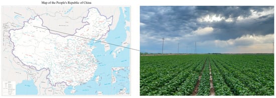 The experiment was conducted in 2024 within a cotton field located in the research area of Shihezi University in Beiquan Town, Shihezi City, Xinjiang, China (44°33′61″ N, 85°97′05″ E, Figure 1). The field had been planted with the “Huiyuan 720” cotton variety, sown on 24 April 2024, with a planting density of 175,000 plants/hm2. The experiment employed the traditional wide and narrow row planting method for cotton sowing—a common pattern where wide and narrow rows alternate to optimize light penetration, air circulation, and mechanized operations (e.g., fertilization, pest control)—having six rows per film with a spacing of 66 + 10 cm. This configuration means rows are arranged in a repeating cycle of 66 cm (wide row) and 10 cm (narrow row), forming three sets of wide–narrow pairs per film to balance plant spacing and land use efficiency while facilitating drip tube installation. The mulch film width was 2.05 m, accommodating the six rows and ensuring proper coverage for the subsurface drip system. During the entire growth period, drip irrigation was applied with one film and two tubes, wherein drip tubes are placed beneath the mulch film to deliver water and nutrients directly to root zones. The two tubes per film ensure uniform water supply across all six rows, especially in the narrow rows, by matching the row spacing and irrigation coverage requirements. The experimental site was moderately fertilized in such a way that fertilizers were applied to the cotton field in amounts consistent with typical agricultural practices in the region but not excessive enough to cause nutrient imbalances or excessive growth. Specifically, a balanced fertilizer was employed, which provided the crop with essential nutrients such as nitrogen (N), phosphorus (P), and potassium (K) at a level intended to support healthy growth and development without exceeding standard agronomic recommendations.