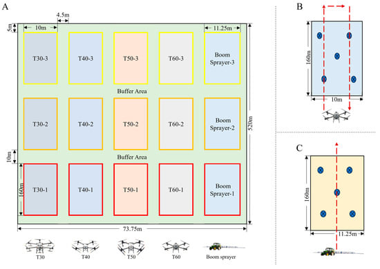 As shown in Figure 2A, the spraying area for the UAV was 1600 m2 (10 m × 160 m) and spraying area for the boom sprayer was 1800 m2 (11.25 m × 160 m), with three repetitions for each spraying operation. The first spraying was conducted from 8:00–12:00 on 14 July 2024 (UTC+8) to control cotton aphids (Aphis gossypii Glover) with 22.4% spirotetramat SC (Hebei Mingshun Agricultural Technology Co., Ltd., Shijiazhuang, China) at a rate of 375 mL/ha. At the time of spraying, the cotton plants were at the flower and boll forming stage, and the average plant height was 74 cm. The second spraying was conducted from 11:00–16:00 on 4 September 2024 (UTC+8) in order to promote cotton boll opening and defoliation. The treatment involved a combination of 360 g/L thidiazuron and 180 g/L diuron SC (180 mL/ha for the UAV and 360 mL/ha for the boom sprayer, Hebei Noda Agricultural Chemicals Co., Ltd., Shijiazhuang, China) along with a 40% ethephon solution (900 mL/ha for UAV and 1800 mL/ha for boom sprayer, Jiangsu Anpon Electrochemical Co., Ltd., Huaian, China). At this stage, the cotton was at the boll opening stage, and the average plant height was 92 cm, with approximately 40% of the cotton bolls already opened [30]. After 7 days, a third spraying with the UAV was conducted from 11:00–14:00 on 11 September 2024 (UTC+8), using the same formulations: 360 g/L thidiazuron·180 g/L diuron SC (180 mL/ha) and 40% ethephon solution (900 mL/ha).