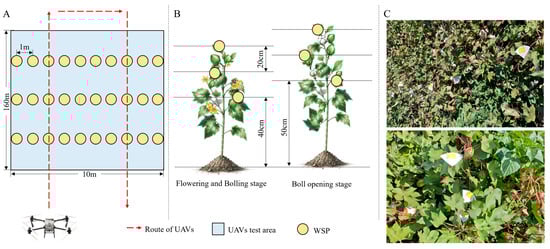 Water-sensitive paper (WSP, Hebei Mingshun Agricultural Technology Co., Ltd., Shijiazhuang, China) was utilized to assess the key deposition characteristics which include coverage, number of spray impacts/stains, and deposition of the impact/stains [32]. WSP was used because it provides a visual assessment of droplet coverage and uniformity, and WSP is the most widely used artificial collector worldwide for the rapid assessment of spray distribution behavior in the field [33]. Three sampling lines, each of which contained 10 sampling points with an interval of 1.0 m, were set along the UAV flight route, and the distance between the sampling lines was set to be 10 m (Figure 3A). Each sampling point was further divided into three parts and named as upper, middle, and lower layers. For the spraying at the flowering stage, the WSPs were placed at heights of 30, 50, and 70 cm from the ground. At the same time, the heights of WSPs for the boll opening stage were set to be 50, 70, and 90 cm above the ground (Figure 3B,C). Nearly 30 s after spraying, all WSPs were collected and placed in ziplock bags and then transferred to the laboratory for further analysis. Each bag was labeled describing the treatment, replication, and site information. In the laboratory, further analysis was performed after scanning the WSPs at a resolution of 600 dpi with a scanner (FileScan2500, Shanghai Zhongjing Technology Co., Ltd., Shanghai, China). ImageJ software (ImageJ 1.3 8, National Institutes of Health, Bethesda, MD, USA) was then used to extract droplet deposits from the digital image to analyze the number of spray deposits, the area coverage, and the droplet deposition [32].