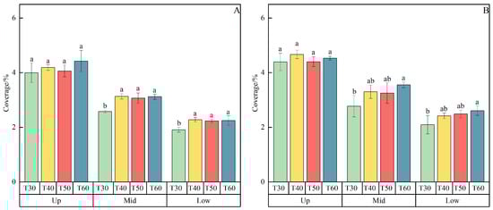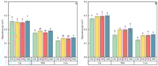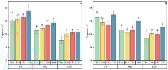 When the UAVs were used to spray harvest aids, the droplet depositions for T30, T40, T50, and T60 were 0.278 (μL/cm2), 0.294 (μL/cm2), 0.296 (μL/cm2), and 0.299 (μL/cm2), respectively. No significant differences were observed among the treatments. In the middle layer of the cotton canopy, the droplet depositions for the treatments with T30, T40, T50, and T60 were 0.161 (μL/cm2), 0.198 (μL/cm2), 0.198 (μL/cm2), and 0.208 (μL/cm2), respectively. The droplet depositions for T40, T50, and T60 were significantly higher than that of T30. In the lower layer of the cotton canopy, the droplet depositions for T30, T40, T50, and T60 were found to be 0.125 (μL/cm2), 0.157 (μL/cm2), 0.158 (μL/cm2), and 0.164 (μL/cm2), respectively. The droplet depositions of T40, T50, and T60 were significantly higher than that of T30. UAV models with stronger wind fields, such as T60, facilitated better penetration and deposition into the lower canopy layers, which is more directly reflected in deposition data (Figure 6), whereas coverage may not fully capture this benefit due to non-uniform leaf surface exposure.