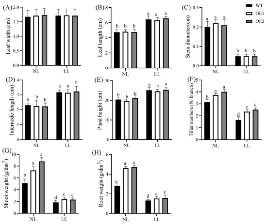 Effects of low light on morphological traits and biomass accumulation. Leaf width (A), leaf length (B), stem diameter (C), internode length (D), plant height (E), tiller number (F), shoot fresh weight (G), and root fresh weight (H). Data represent mean ± standard error (SE). Different letters indicate significant differences at p ≤ 0.05. NL: normal light (photosynthetically active radiation of 800 μmol/m2/s); LL: low light (photosynthetically active radiation of 120 μmol/m2/s); WT: wild-type; OE1/OE2: CdGLK1-overexpressing lines.
