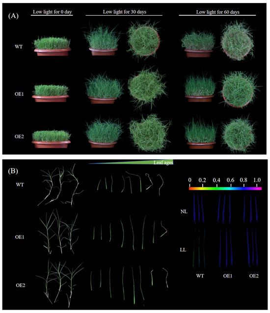 The experimental protocol was executed over a 60-day period under a bifactorial framework incorporating photosynthetically active radiation (PAR) levels and plant genotypes. The light treatments included control light (PAR: 800 μmol/m2/s) and low-light treatment using an 80-mesh sunshade net (PAR: 120 μmol/m2/s). The source of radiation in the described light treatments was LED tubes (Sansilighting Co., Ltd., Shanghai, China). Three pots of plants (three replicates) for each of the WT and CdGLK1-overexpressing lines (OE1 and OE2) were randomly placed in each of the two growth chambers under either control or low-light stress. Three biological replicates per genotype, including the wild-type (WT) and two independent CdGLK1-overexpressing lines (OE1, OE2), were systematically distributed across environmentally controlled growth chambers using randomized complete block design principles. During the treatment, none of the grass was clipped, but the other management conditions were the same as above. After 60 days of low-light treatment, the fifth leaves (counted from the top) of bermudagrass were measured using an Imaging-PAM chlorophyll fluorometer equipped with a computer-operated PAM-control unit (IMAG-MAXI; Heinz Walz, Effeltrich, Germany). Chlorophyll fluorescence profiling of the nodal position 5 leaves was carried out using a modulated Imaging-PAM system. Samples of leaves were taken from nodal positions 2–5 per tiller, immediately cryopreserved in liquid N2, and then stored at −80 °C for further analyses.