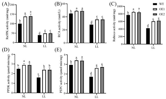 Effects of low light on enzyme activities related to photosynthetic carbon metabolism. Ribulose-5-phosphate kinase (Ru5PK, (A)), Rubisco activase (RCA, (B)), ribulose-1,5-bisphosphate carboxylase/oxygenase (Rubisco, (C)), pyruvate orthophosphate dikinase (PPDK, (D)), and phosphoenolpyruvate carboxylase (PEPC, (E)). Data represent mean ± standard error (SE). Different letters indicate significant differences at p ≤ 0.05. NL: normal light (photosynthetically active radiation, 800 μmol/m2/s); LL: low light (photosynthetically active radiation, 120 μmol/m2/s); WT: wild-type; OE1/OE2: CdGLK1-overexpressing lines.