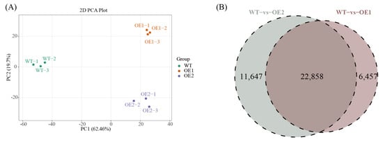 Transcriptomic analysis of differentially expressed genes (DEGs). Principal component analysis (PCA) of 9 samples (A) and Venn diagram of DEGs in comparisons between OE1 and WT and between OE2 and WT (B).