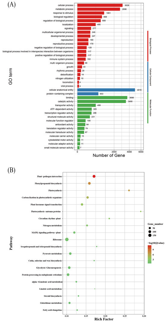 Enrichment factor plot. (A) GO term classification of differentially expressed genes (DEGs). (B) KEGG enrichment analysis of bermudagrass under different treatment groups.