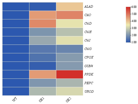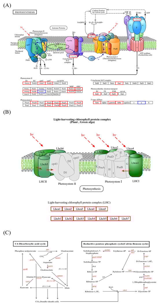 Additionally, DEGs related to carbon fixation in photosynthetic organisms were further investigated (Figure 8C). The results revealed that, compared with the WT, a total of 69 DEGs were enriched, among which 14 were significantly downregulated and 55 were significantly upregulated. Specifically, within the Calvin–Benson cycle, 13 genes (xfp, rbcL, PGK, GAPDH, GAPA, TPI, ALDO, FBP, tktA, glpX-SEBP, rpiA, PRK, and RPE) were significantly upregulated. Additionally, in the C4-dicarboxylic acid cycle, eight genes (pckA, PPDK, GPT, E1.1.1.39, PEPC, GOT1, MDH1, and maeB) were significantly upregulated. Among these genes, PPDK and PEPC are crucial rate-limiting enzymes in the C4 cycle. These findings demonstrate that the activity or efficiency of both the Calvin–Benson cycle and the C4-dicarboxylic acid cycle in the overexpression of transgenic lines was enhanced under low-light conditions. Additionally, the transcriptome data and qRT-PCR data show consistent results (Figure 9).