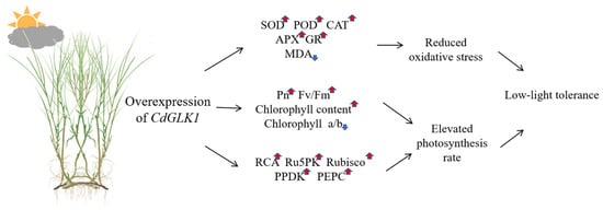 Schematic diagram showing how the overexpression of CdGLK1 improves low-light tolerance in bermudagrass. Red arrows indicated upregulated trends and blue arrows indicated downregulated trends.