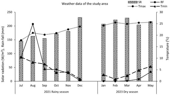 Monthly averages of solar radiation (SR), total rainfall (RF), and maximum (Tmax) and minimum (Tmin) temperatures were recorded during the 2021 rainy season and the 2023 dry season in the study area.