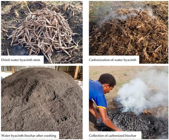 To produce water hyacinth biochar (WHB), approximately 0.4–0.5 kg of water hyacinth biomass was heaped and covered with teff (Eragrostis tef) straw and a layer of soil to restrict oxygen flow during combustion. The pile was ignited using locally available matches. The pyrolysis conditions of temperature and residence time were inferred from the physico-chemical properties of the resulting biochar, including pH, cation exchange capacity (CEC), and total carbon content. These characteristics closely matched those reported by Gezahegn et al. [11], who produced WHB from the same Lake Tana biomass using a laboratory pyrolysis furnace at temperatures of 350 °C, 550 °C, and 750 °C. Based on this comparison, the pyrolysis temperature for WHB in this study was estimated to range between 500 °C and 600 °C, with a residence time of approximately 50 to 60 min. After pyrolysis, the biochar was cooled with water, then sun-dried, manually crushed, and sieved to particle sizes of less than 2 mm for laboratory analysis and less than 5 mm for use in the field. Biochar was produced annually for every season of the experiment, utilizing water hyacinth biomass collected from the same location and employing identical procedures (Figure 2).