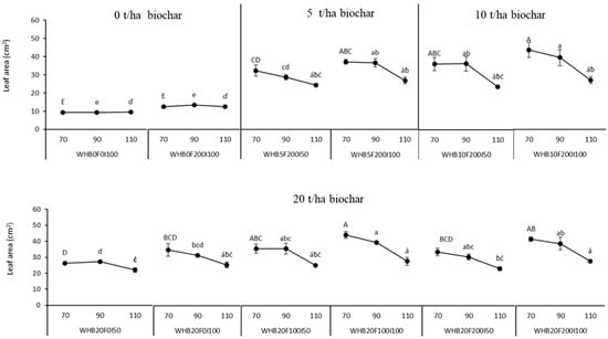 Leaf area generally increased at 70 DAS and decreased afterward, irrespective of treatment (Figure 3). Significant main effects of biochar, fertilizer, and irrigation were observed, along with a highly significant two-way interaction between biochar and irrigation (p < 0.001; Table A1). Although the three-way interaction was not significant (p > 0.05), a higher leaf area was recorded with the combination of a higher rate of WHB and fertilizer under full irrigation. Leaf area significantly (p < 0.001) increased with increasing WHB when combined with fertilizer and irrigation. The highest leaf area (44.4 cm2) was observed in treatments amended with WHB20F100I100 at 70 DAS, compared to plots without WHB and those with lower WHB rates under 50% irrigation (Figure 3). Leaf area significantly (p < 0.001) increased from 9.39 cm2 (WHB0F0I100) and 12.5 cm2 (WHB0F200I100) to 44.4 cm2 (WHB20F100I100) on 70 DAS, maintaining higher leaf area on 90 and 110 DAS compared to plots without biochar and those with lower WHB rates. Leaf area was greater in plots amended with 200 kg ha−1 fertilizer than in plots without fertilizer, even when combined with the same amount of biochar and irrigation water.