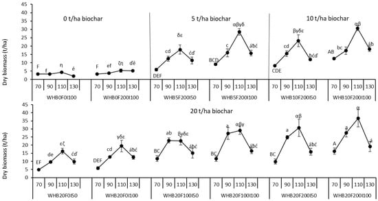 Different rates of locally produced water hyacinth biochar (WHB), inorganic fertilizer(F), and different irrigation regimes (I) affect the dry biomass of wheat during the 2023 dry season cropping season. Mean separation was performed independently for each day after sowing (DAS) across the different treatments. Different English, Greek and Latin letters with accent marks indicate significant differences between treatments at a 5% significance level. The bars represent the standard deviation of the means.