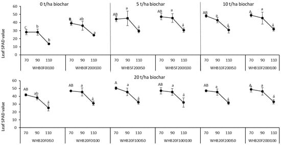 The leaf SPAD value generally decreased from 70 to 110 DAS, regardless of treatment (Figure 5) in the dry season. There was a significant (p < 0.001) increase in SPAD values from 28.1 (WHB0F0I100) to 50.4 (WHB20F100I50) with continued significant differences on 90 and 110 DAS. The SPAD values were significantly influenced by the main (p < 0.001) and interaction (p < 0.01) effects of biochar and fertilizer (Table A1). There were no significant differences among the treatments that received different rates of biochar application. However, a significant difference was observed between the biochar-amended and unamended treatments (Figure 5).