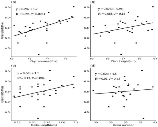 Correlation between dry biomass (a), plant height (b), spike length (c), and grain number (d) and grain yield during the 2021 rainy season.