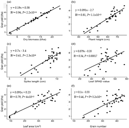 In the rainy season (Figure 7), plant height, dry biomass, spike length, and grain number exhibited a positive correlation with grain yield; however, the correlation was not statistically significant, except for dry biomass. Despite its low value, the best r2 value was observed for the dry biomass during the rainy season. Spike length showed the highest correlation (0.66), although it was not significantly correlated with grain yield during the rainy season.
